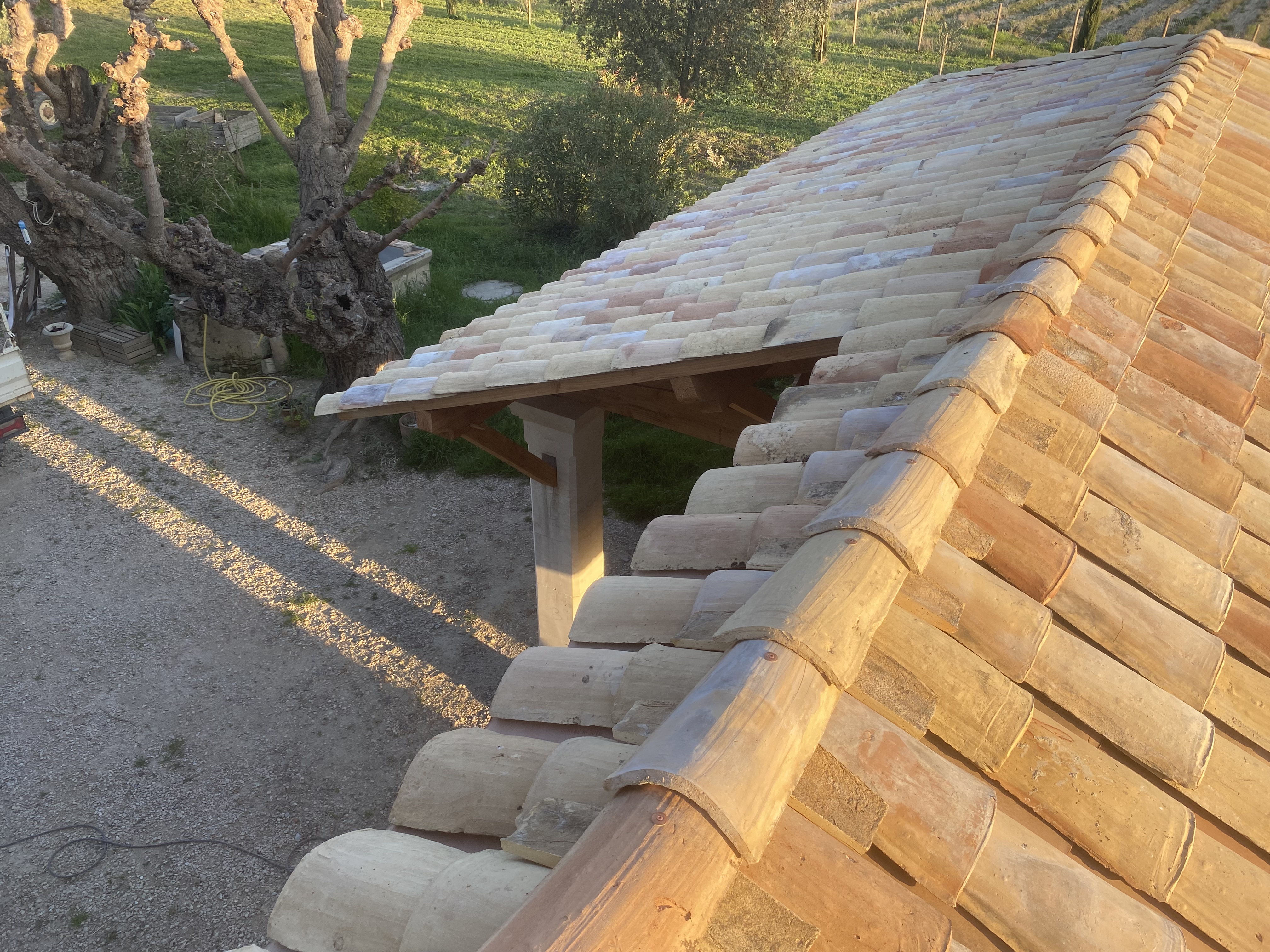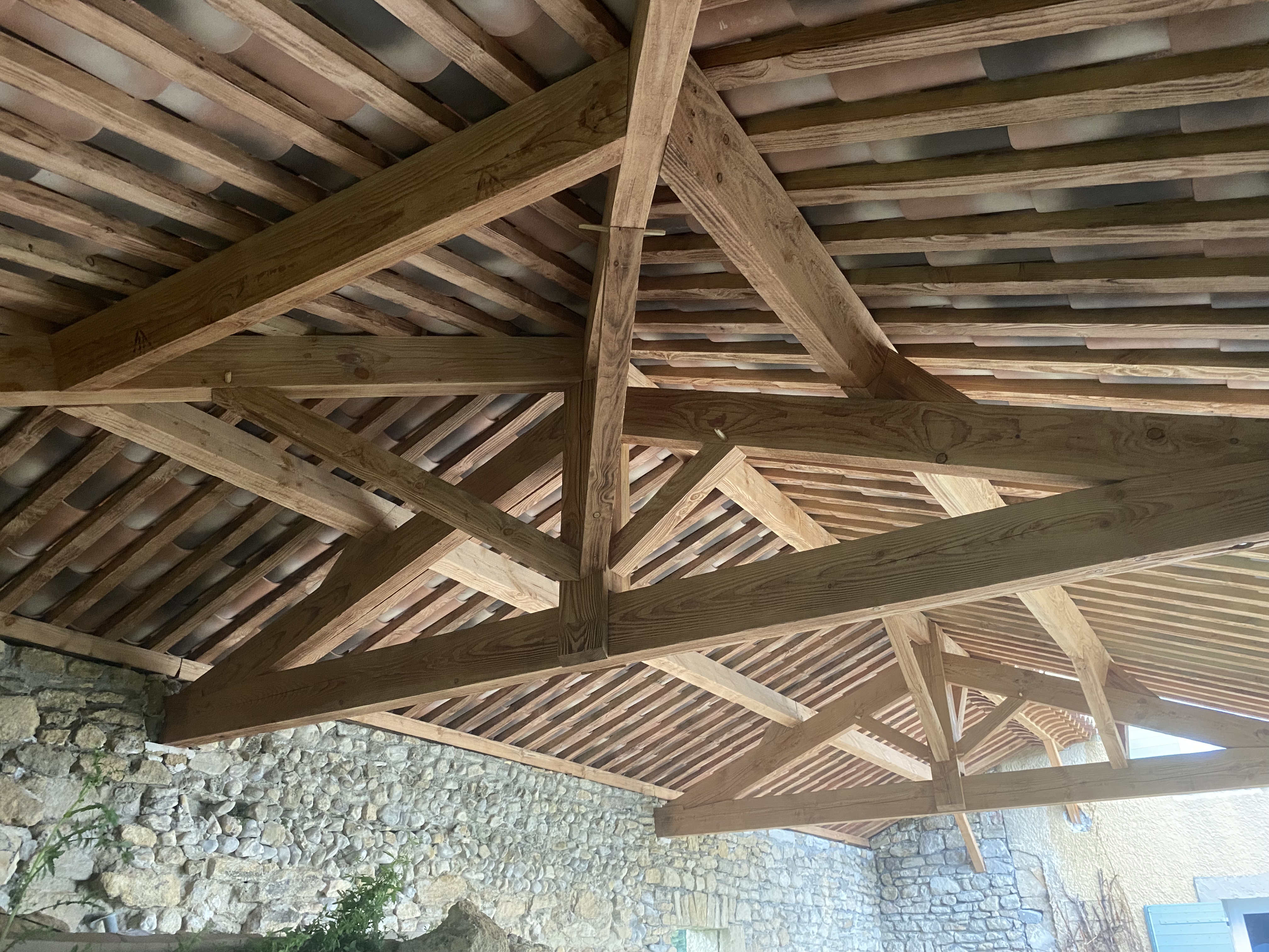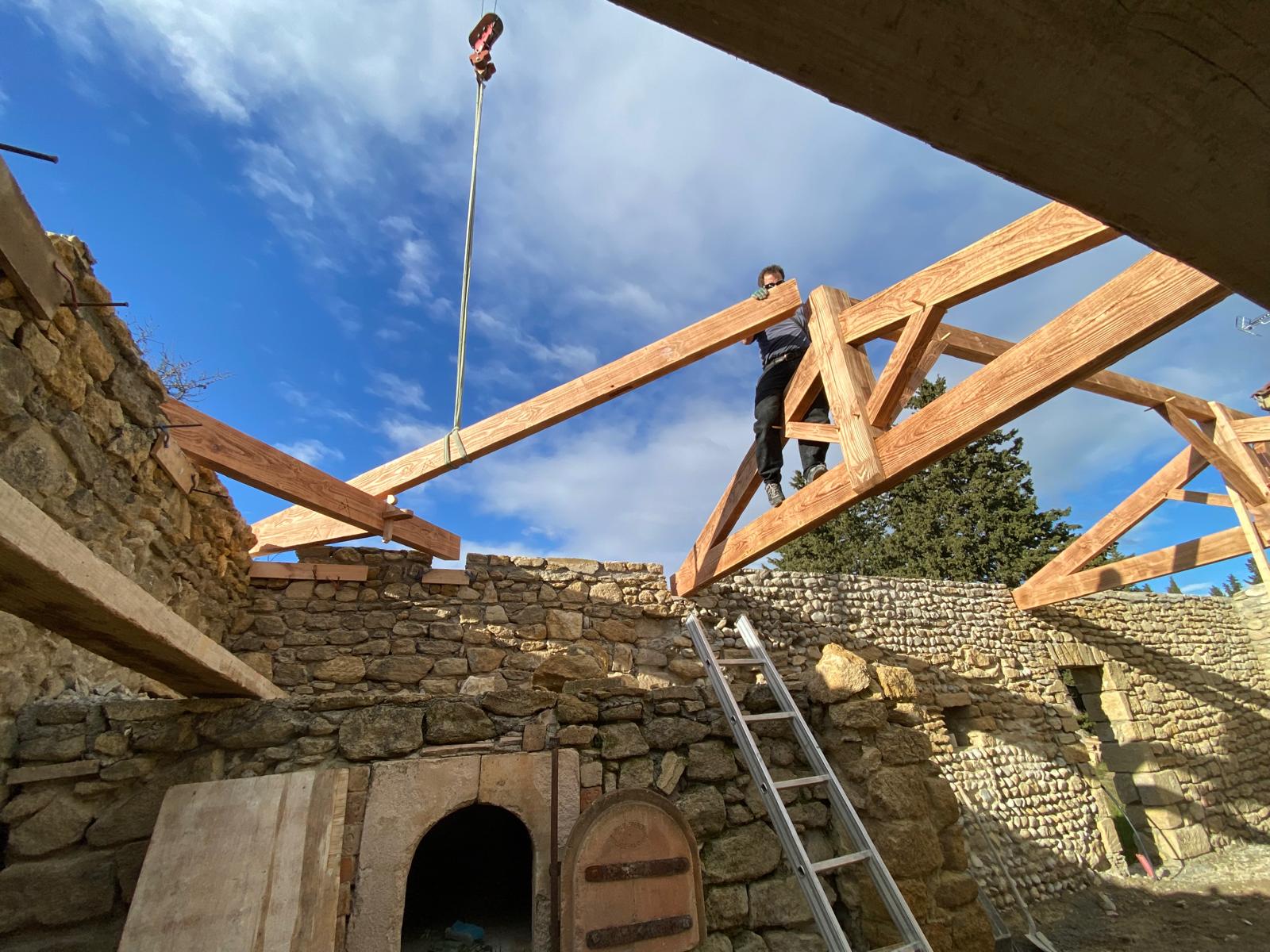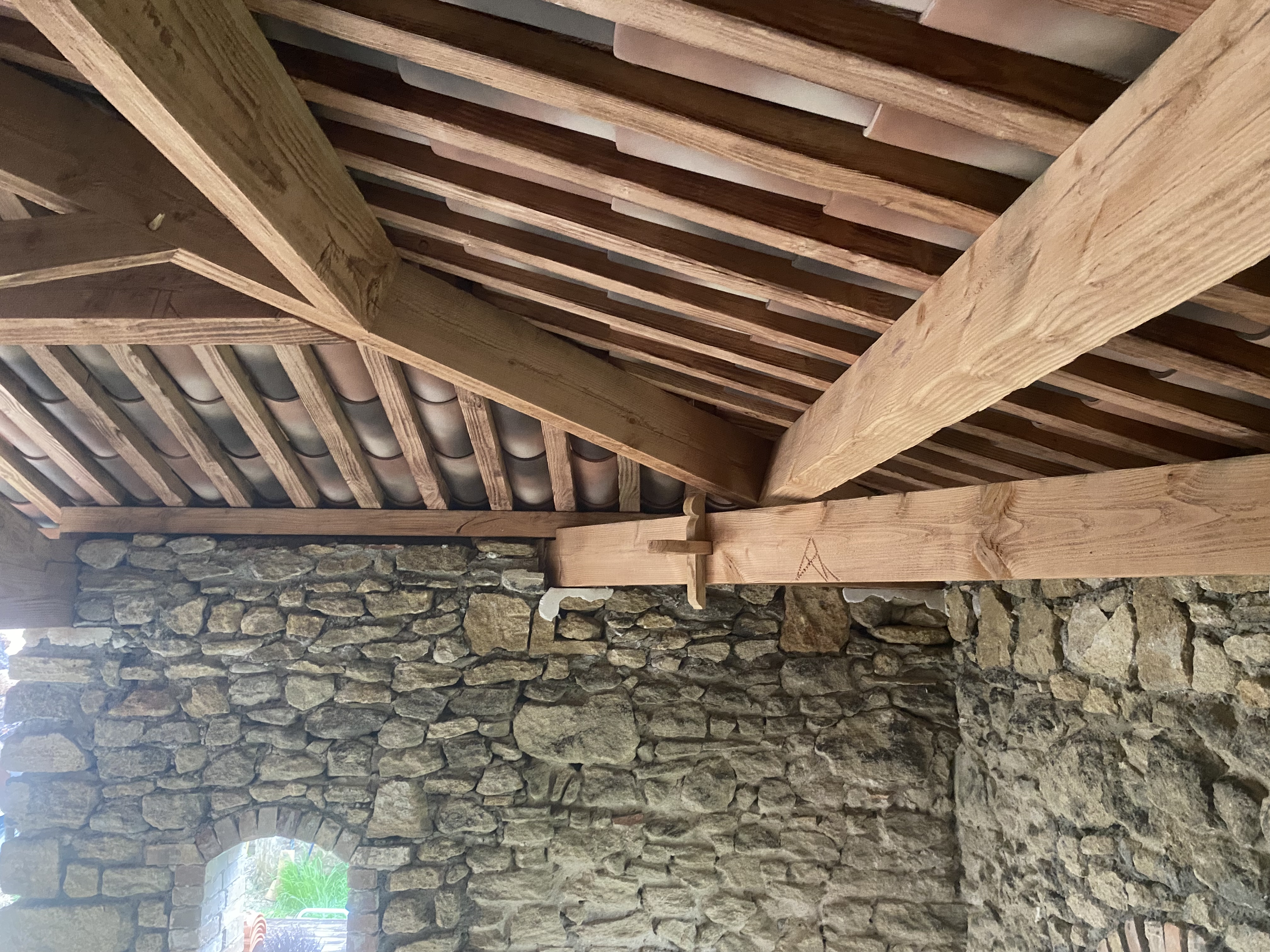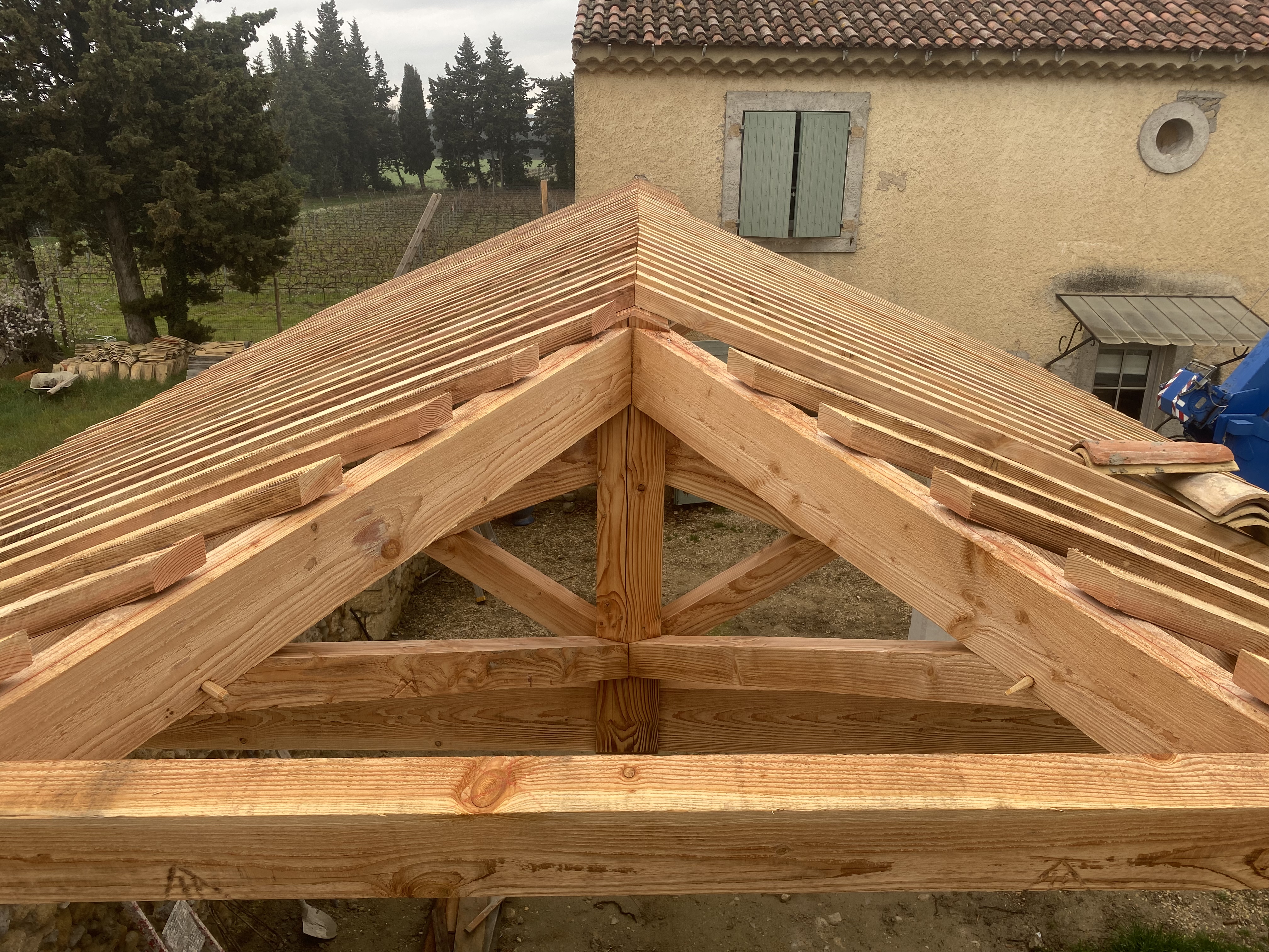 05/01/2026Fabrication d'une charpente en douglas sur une vielle bâtisse, tuiles canal neuves en courant et tuiles canal anciennes en couvert