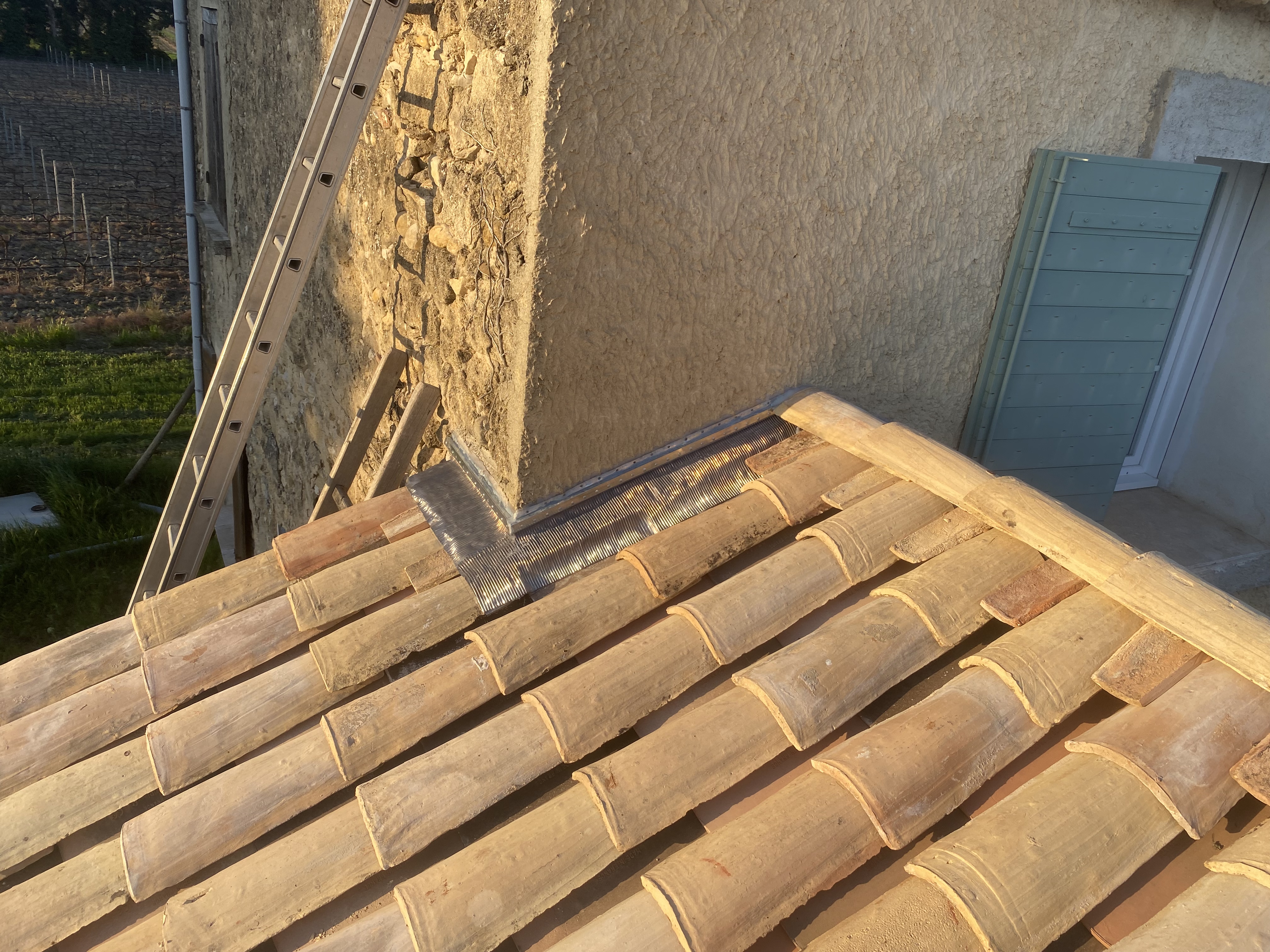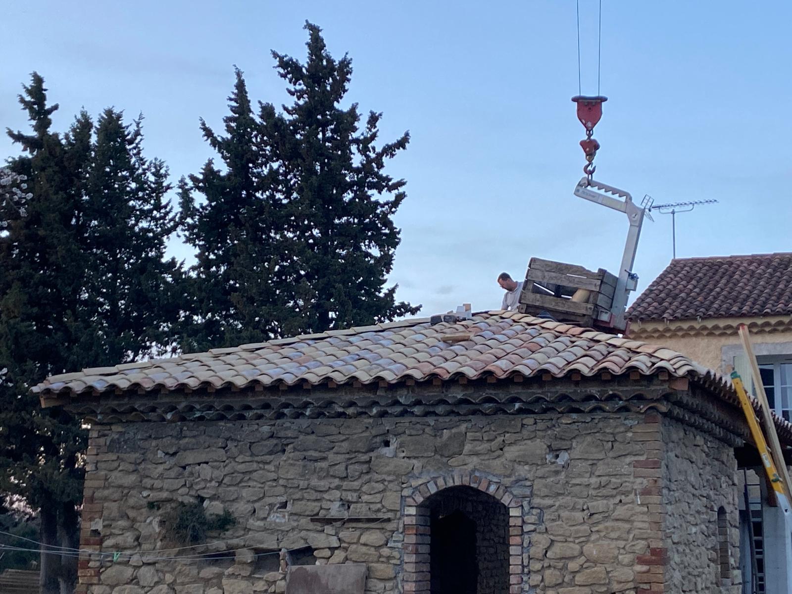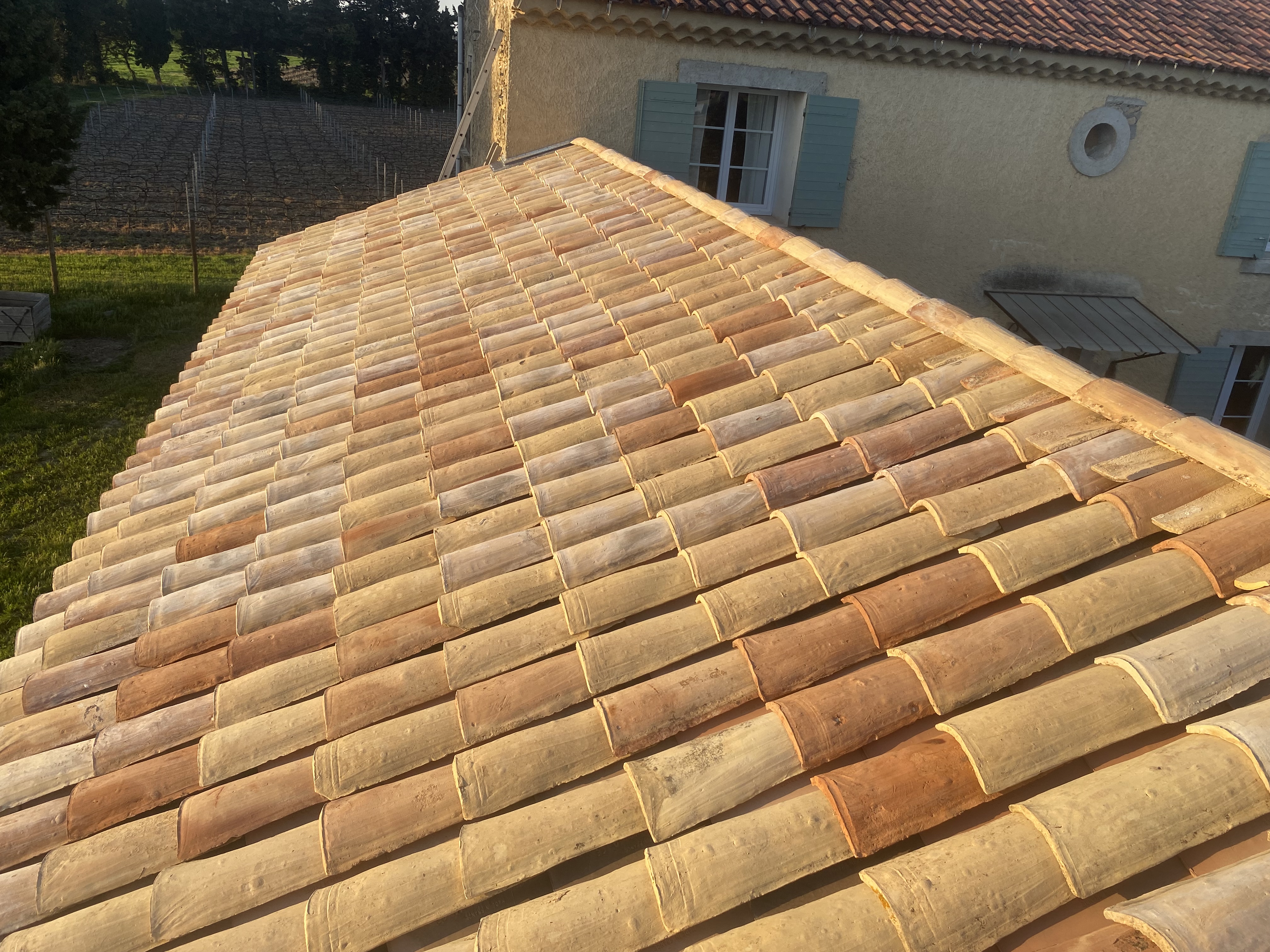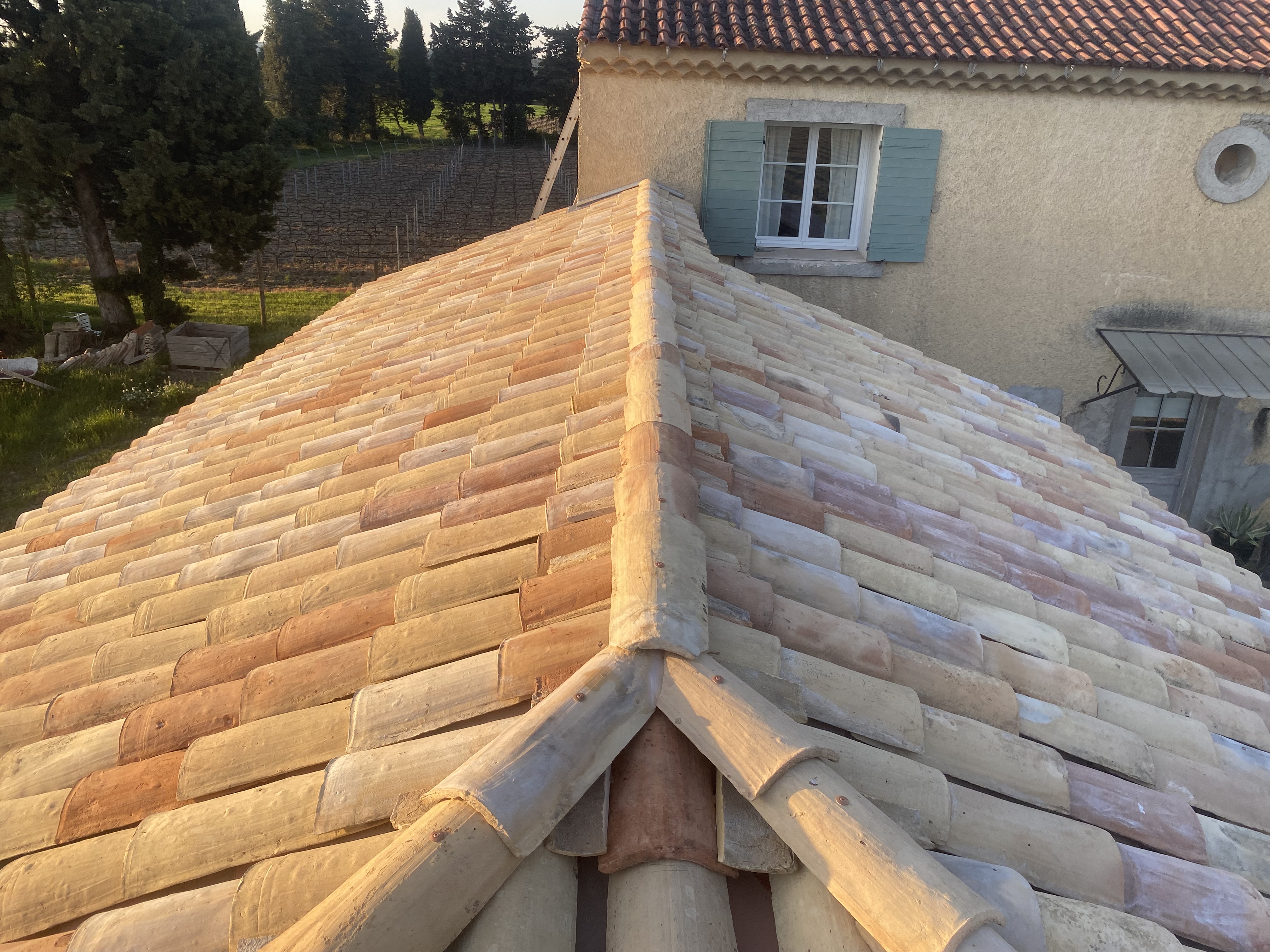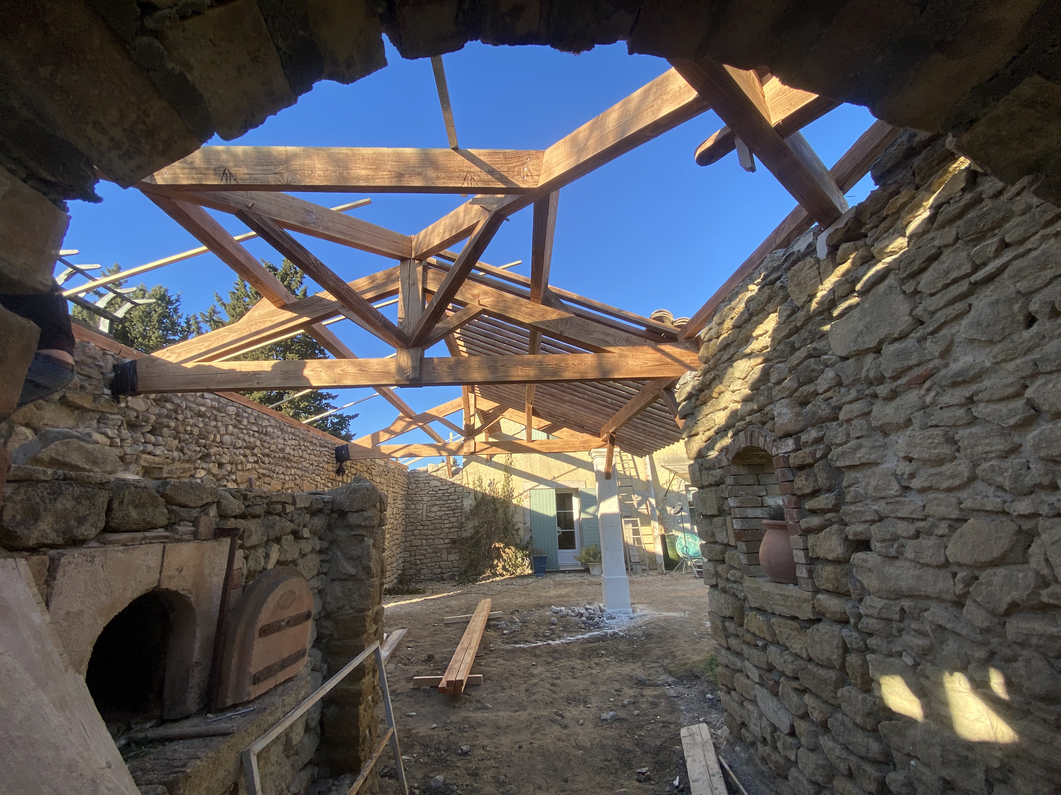 05/01/2026Fabrication d'une charpente en douglas sur une vielle bâtisse, tuiles canal neuves en courant et tuiles canal anciennes en couvert